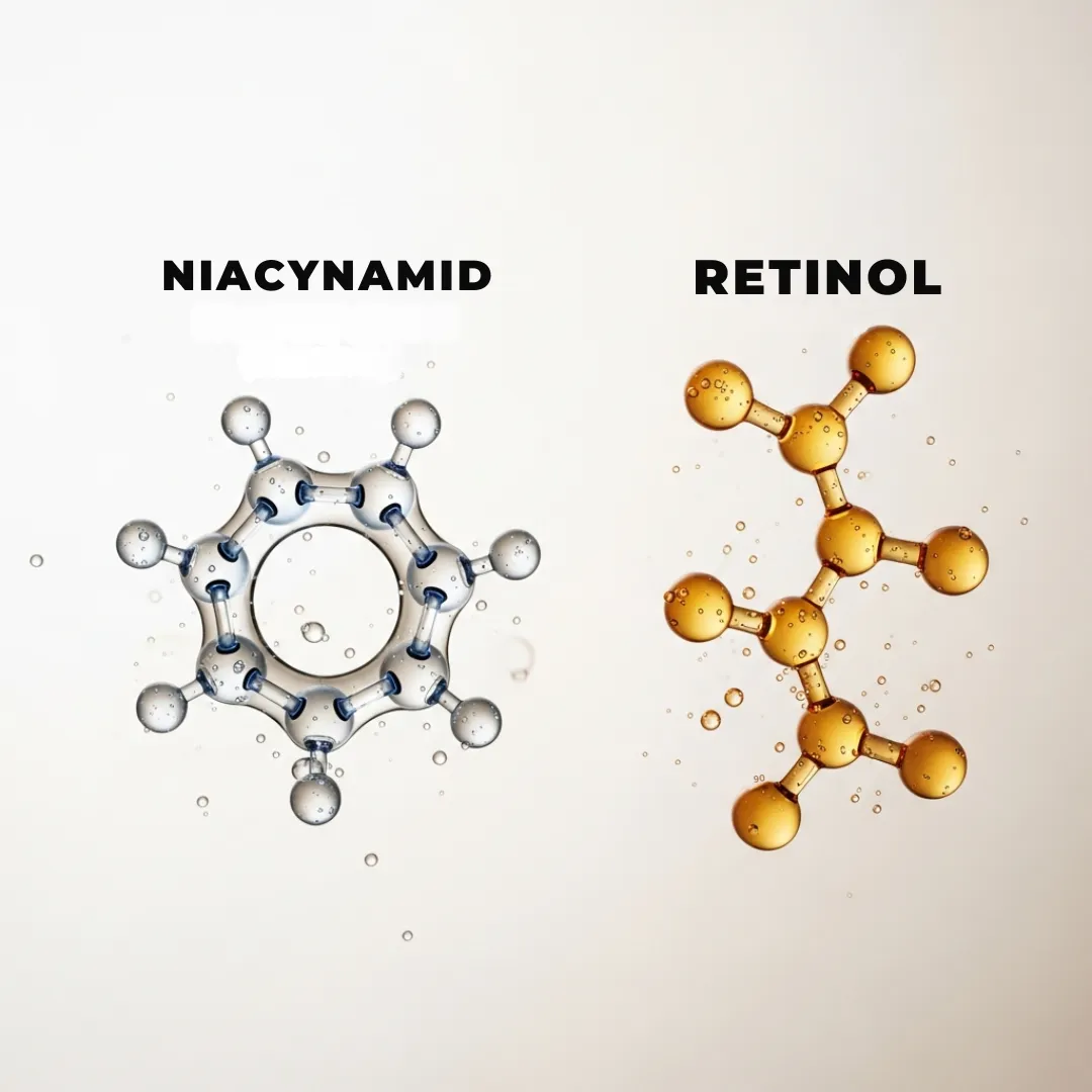 Niacynamid + witamina C, retinol + kwasy, peptydy + eksfolianty.
