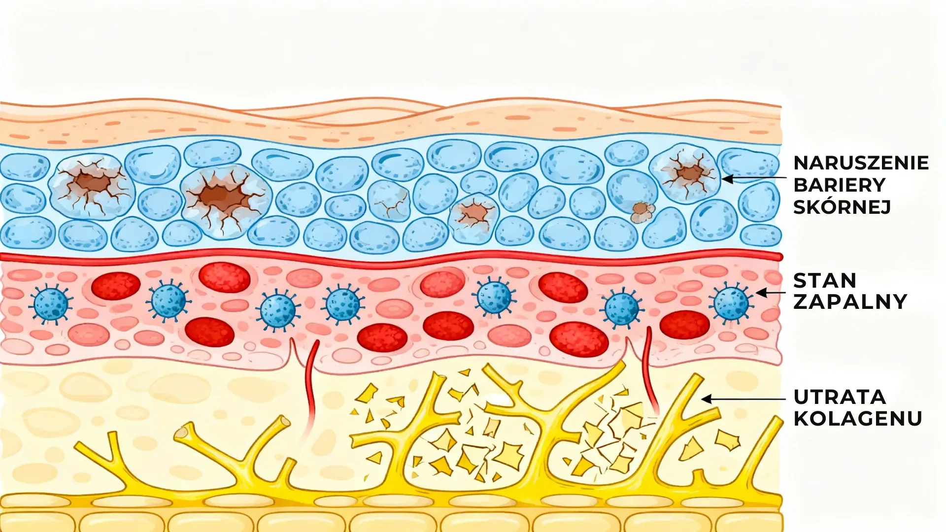 Układ odpornościowy reaguje, ale ciągłe alarmy prowadzą do przewlekłego stanu zapalnego, który rozkłada kolagen szybciej, niż może się on odbudować.